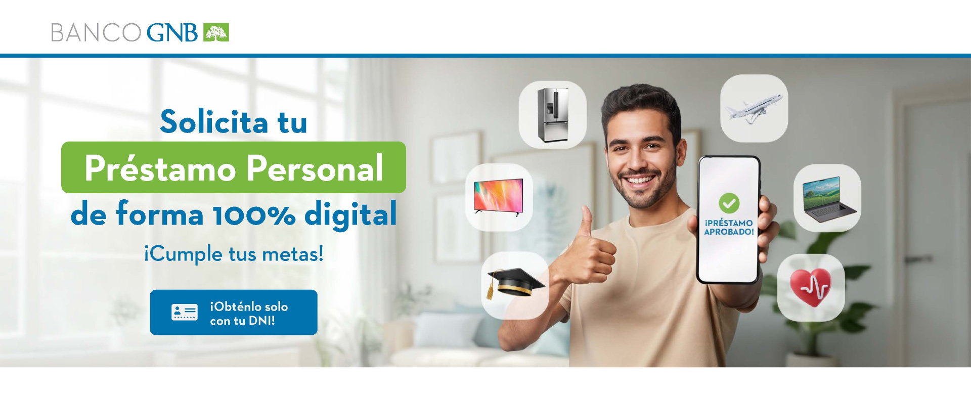 Crédito libre disponibilidad: TCEA máxima referencial calculada considerando una TEA de 43.00% en soles, aplicable para un monto de S/5,000.00 y un plazo de 12 meses, con una cuota de S/ 508.02, que incluye al Seguro de desgravamen mensual de 0.0738%, conforme al tarifario vigente. En caso de atraso en el pago de las cuotas, aplicará una tasa de interés moratorio nominal anual de 15.50% (TNA) en soles a partir del primer día de vencida la cuota y sobre la porción del capital de la(s) cuota(s) vencida(s). Año base: 360 días. ITF: 0.005%. Condiciones: Vigencia de campaña desde 01/04/2026 hasta el 30/04/2026. Sujeto a evaluación crediticia. Mayor información de tasas, comisiones, gastos y demás condiciones aplicables, consulta nuestro tarifario y la información difundida en www.bancognb.com.pe y en nuestras agencias. Toda mención a BANCO GNB está referida a Banco GNB Perú S.A., con RUC N° 20513074370. Información brindada de conformidad con Ley N° 28587 y el Reglamento de Gestión de Conducta de Mercado del Sistema Financiero, aprobado mediante Resolución SBS N° 3274-2017 y normas que lo modifiquen.