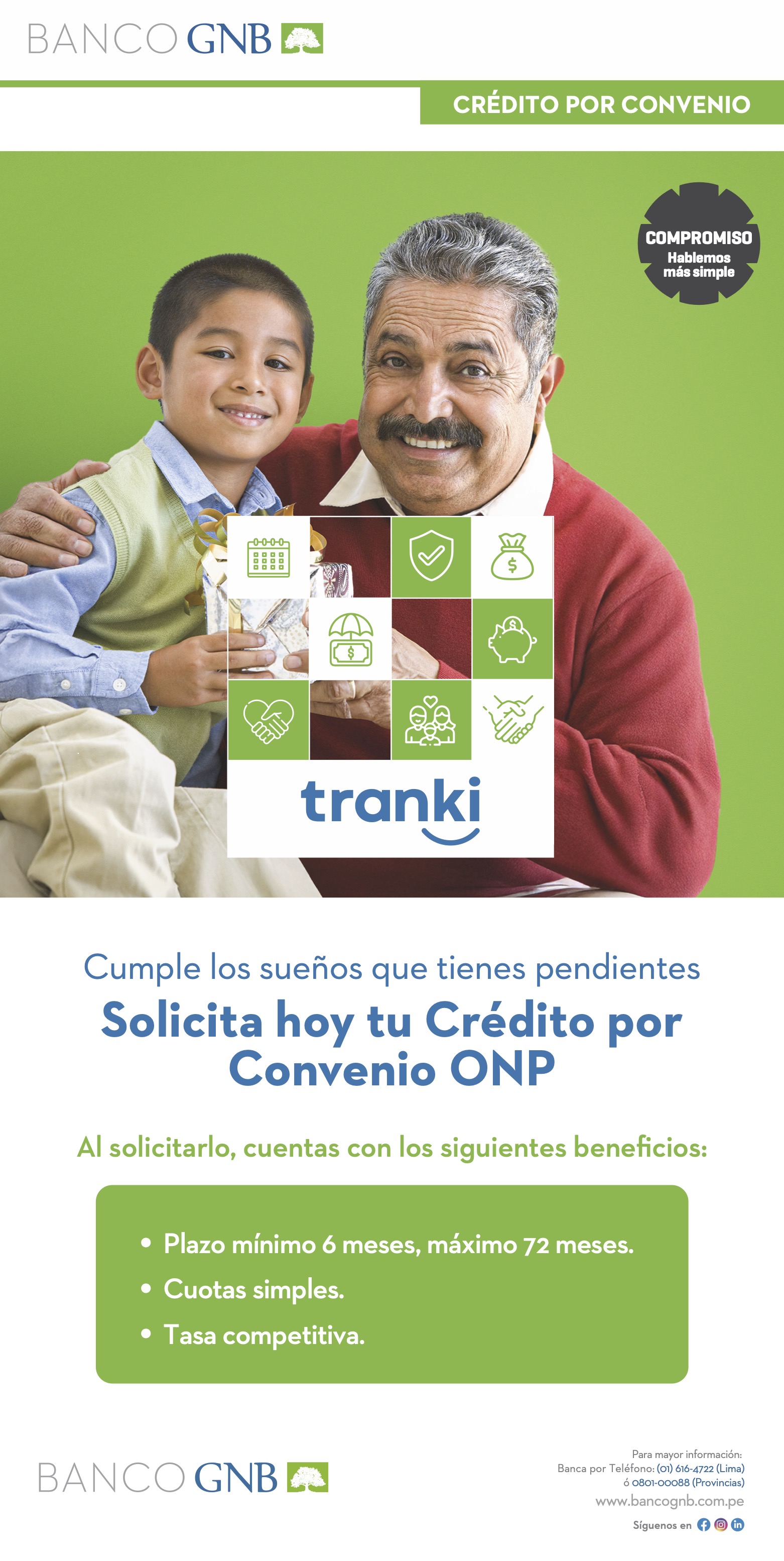 TCEA de 27.50% aplicable a Crédito por Convenio ONP con seguro de desgravamen, sujeto a evaluación crediticia. Ejemplo: Para un Crédito por Convenio ONP de S/5,000.00 a un plazo de 12 meses considerando una TEA de 26.00%, la cuota mensual aproximada sería de S/491.84 que incluye total de intereses de S/870.49 por el periodo del crédito con TCEA de 27.50% y seguro de desgravamen mensual de 0.0738% conforme al tarifario vigente, sin considerar otros gastos y/o comisiones. ITF:0.005%. Información brindada conforme a la Ley N° 28587 y el Reglamento de Gestión de Conducta de Mercado del Sistema Financiero aprobado mediante Resolución SBS N°3274-2017. Para mayor información sobre tasas, comisiones, gastos y demás conceptos aplicables, consulte nuestro tarifario ubicado en nuestra web www.bancognb.com.pe y en nuestras agencias. Banco GNB Perú S.A., con RUC N° 20513074370.
